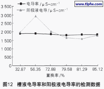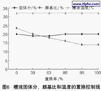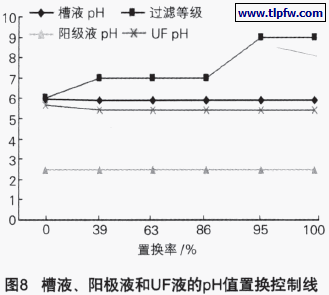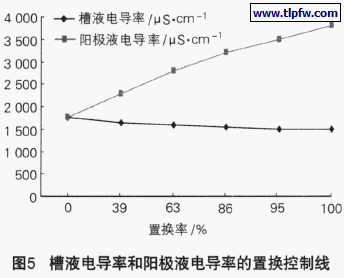 由于ED5和ED6两者的槽液工艺参数不尽相同,因此预先确定不同置换率下的工艺参数控制曲线对置换工作来说极其重要,这将指导整个置换过程、监控槽液参数,以便对出现的异常能够及时地加以调整。有关工艺参数的控制指导曲线见图5~图8。