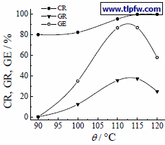 图1 接枝聚合温度对CR、GR 和GE 的影响