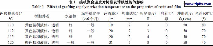 表1 是接枝聚合温度对树脂及漆膜性能的影响。由表1 可知,在110 ~ 115 °C 的接枝温度范围内,树脂和漆膜的综合性能较好,并在115 °C 达到最好的水平;聚合温度为120 °C 时,树脂的颜色变深,漆膜泛黄,光泽度下降。故接枝聚合反应温度以115 °C 为宜。