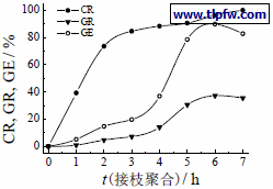 图2 是在115 °C 的接枝聚合温度下,聚合时间对接枝体系的CR、GR 和GE 的影响(聚合条件同上)。