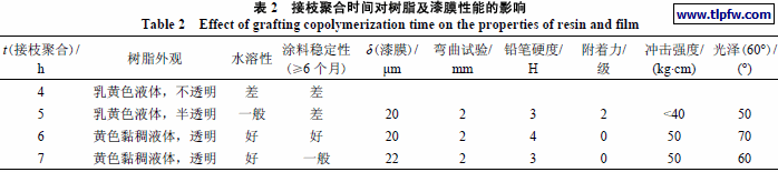 表2 是接枝聚合时间对树脂及漆膜性能的影响。它表明,接枝聚合时间为6 h 时,树脂及其漆膜的性能最好。原因是接枝物的GR 达到较高水平,树脂的水溶性与稳定性好。当聚合时间为4 h 时,由于体系的GR 很低,故树脂不透明,水溶性差,导致树脂难以配制成涂料;聚合时间为5 h 或7 h 时,由于体系的GR 仍未足够高,导致树脂及漆膜的某些性能不够理想。试验表明,接枝体系的GR 是影响树脂及其漆膜性能的主要因素,接枝率高的树脂及其漆膜具有较好的