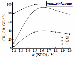 图3 显示,当BPO 用量为1.2% ~ 1.5%时,CR、GR 和GE 同时提高。说明随着BPO 用量的增加,接枝速率提高,所形成的接枝链增多,而形成非接枝共聚物的量减少。