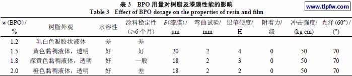 表3 是接枝体系的BPO 用量对树脂及漆膜性能的影响。由表3 可见,当BPO 用量为1.5%时,树脂和漆膜的综合性能最佳;BPO 用量为1.2%时,树脂水溶性差,难以制成阴极电泳涂料;用量太大时,树脂的颜色变深,树脂贮存稳定性变差,漆膜的综合性能下降。因此,BPO 用量以1.5%为宜。