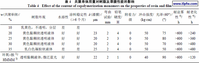 表4 是共聚单体用量对树脂及漆膜性能的影响。由表4 可见,共聚单体用量在20% ~ 30%的范围内,树脂和漆膜的综合性能较好,并在30%时达到最佳;共聚单体用量太大或太小都会导致树脂的外观、水溶性和稳定性变差。当共聚单体用量为10%时,接枝体系在聚合反应后期出现分层现象,溶液的稳定性差,从而不能配漆。表4 还对环氧–丙烯酸树脂涂料漆膜与用三聚氰胺–甲醛树脂作交联剂的环氧–胺涂料漆膜的性能作了比较,发现环氧–胺/HMMM 漆膜的光泽度较高,但硬度和冲击强度较低。由表4 可见,随着共聚单体用量的增加,漆膜的耐老化性能提高,并能保持环氧–胺/HMMM 漆膜优良的耐盐雾性。与环氧–胺/HMMM 相比,环氧–丙烯酸酯漆膜的耐老化性能明显提高。