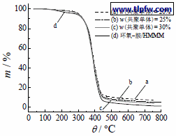 图5 是环氧–丙烯酸酯漆膜与环氧–胺/HMMM 漆膜的TG 曲线。图5 表明,共聚单体用量不同的环氧–丙烯酸酯漆膜都有优良的热稳定性,而环氧–胺/HMMM 漆膜在130 °C 就有明显的热失重,说明其热稳定性较差。