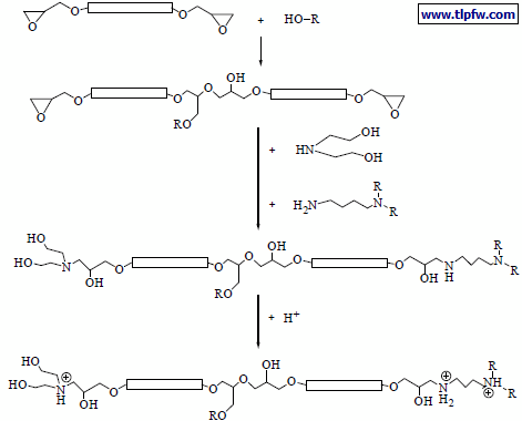 液态环氧树脂与双酚A 扩链生成一定环氧当量的树脂,然后用胺作催化剂开环,再加入交联树脂,最后酸化得到改性环氧树脂。反应历程如下: