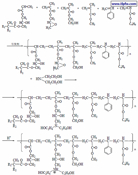 叔碳酸缩水甘油酯、丙烯酸、甲基丙烯酸甲酯、甲基丙烯酸丁酯、甲基丙烯酸缩水甘油酯、甲基丙烯酸羟乙酯等在一定温度下进行自由基溶液聚合反应,然后用胺作催化剂开环,加入交联树脂后,用冰醋酸酸化,得到改性丙烯酸树脂。其合成线路如下: