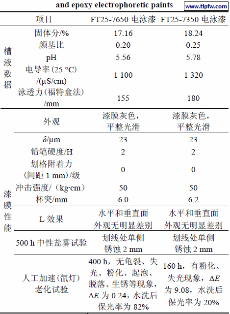 将改性丙烯酸树脂与改性环氧树脂按照一定的比例混合后,乳化得到环氧–丙烯酸电泳漆乳液──FT25-7650。与原来的环氧电泳漆FT25-7350 相比,两者的B 组分(色浆)相同,A 组分(乳液)成分不同。前者的A 组分为改性环氧树脂与改性丙烯酸树脂的混合,后者的A 组分只含有环氧树脂。