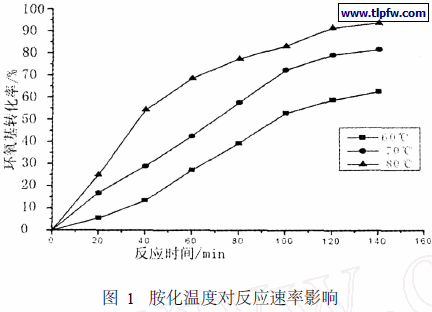 环氧树脂中的环氧基团是活性较高的基团,它与有机胺进行加成反应,在树脂骨架上引入氨基成盐基团,经酸化、自乳化后获得水性阳离子环氧树脂。由于二乙醇胺的价格较低,反应放热少,易控制,故本实验选其作为胺化试剂,实验按环氧基与二乙醇胺物质的量比为1: 1. 2进行。以下为60, 70, 80℃下环氧基的转化率,如图1所示。