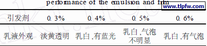 实验发现:实验中采用BPO和A IBN复配,采用比例为BPO: A IBN = 3: 1。实验发现若引发剂使用过多,会造成反应过程中产生气泡并且不能很快消除,乳液黏度也较大。故应加入适量引发剂,以得到比较理想的乳液外观。