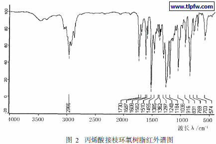 从图2可以看出:在915 cm- 1附近处环氧基的特征吸收峰仍然存在,峰强度变化不大,说明在接枝反应中,环氧基没有遭到破坏。选择苯环为内标物,其吸收峰1608 cm- 1为内标峰,通过吸光度的比值,亚甲基在接枝后含量减少,同时发现在1730 cm- 1附近出现羰基的吸收峰,说明丙烯酸单体已接枝到了环氧树脂上。
