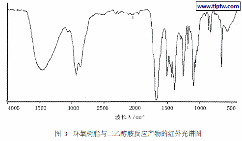 图3是胺化反应产物的红外谱图。从图3中可以看出:在910cm- 1处的环氧基特征吸收峰明显减弱,在3463 cm- 1处的羟基吸收带加宽加深,在1094cm- 1处产生叔胺结构的特征吸收峰。由此,可以证明二乙醇胺与环氧基团发生了加成开环反应。