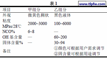 在合成环氧树脂防水涂料时,我们选用了双苯酚A 型环氧树脂,该环氧树脂含有异氰酸基反应的OH 基,通过对E-1009、Epikotelool、E-51、E-44、E-828 等牌号进行实验对比,得出结论认为Epikote-1001 环氧树脂与我们合成的端NCO 聚氨酯预聚体反应,其生产工艺、产品性能较好。(见表2)