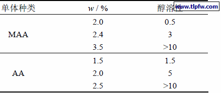 按照配方,固定其他参数,选择功能单体为含有羧基的MAA 和 AA,分别考察2 种单体的用量对树脂体系的醇溶稳定性的影响,结果如表2 所示。可以看出,随着含羧基功能单体质量分数的增加,树脂醇溶性提高,而且其值较高。这是因为羧基在乙醇中容易电离出氢离子,促进聚合物溶胀溶解。当MAA 或者AA 含量达到一定程度时,树脂的醇溶性显著提高,与乙醇呈现无限互溶的趋势,比如MAA 质量分数达到3.5%或者AA 质量分数达到2.5%时,与乙醇的互溶体积比大于1∶10(实际上呈现出无限互溶的趋势),说明醇溶性非常好。对于含量相同的丙烯酸单体和甲基丙烯酸单体,丙烯酸单体更能提高树脂的醇溶性。这是因为甲基丙烯酸单体分子链上的羧基侧端含有一个疏水性基团──甲基,削弱了羧基的亲水能力。