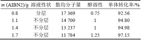 从表6 可以看出,树脂数均分子量随着引发剂AIBN 用量的增加而减小。这是因为随着引发剂浓度的增加,引发剂分离出的活性自由基增多,在单体浓度一定的情况下,分子链的数量增多,链长变短,因此,分子量变小。同时可以看出,引发剂浓度对单体转化率有一定的影响。由于聚合速率随引发剂用量的提高而加快,故单体转化率随着引发剂用量的增加而增大。因为引发剂的浓度增加,自由基的生成速率增大,活性中心和增长链数增多,因此单体转化率提高。虽然较大的分子量使涂膜性能好,但树脂分子量的降低对溶液稳定性有帮助。因此,为了获得较好的醇溶性,同时获得较高的单体转化率,可适当提高引发剂的用量。综合考虑,确定溶剂中引发剂用量为1.7 g。