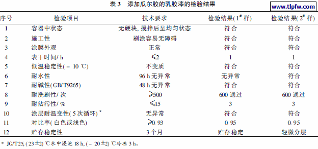 表1 的综合成本比表2 节省约300~ 500 元/ t , 在保证涂料性能符合各项指标的基础上可以适当加大瓜尔胶的使用量, 以进一步的降低成本。