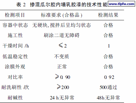 按GB /T 9756- 2001<合成树脂乳液内墙涂料>中的要求取样和制作样板, 技术性能达到了标准规定的合格品的要求, 检测结果见表2。