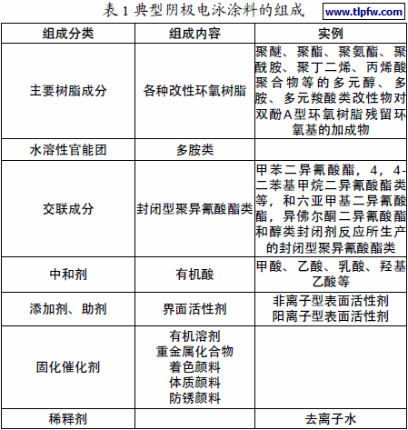 电泳涂料是最早开发的水性涂料之一。它最主要的特点是涂装效率高、经济、安全、污染小、便于自动化规模生产。目前汽车生产所用的主要是阴极电泳涂料,二异氰酸酯单体和醇类封闭剂的反应产物作为交联剂和树脂中的羟基参与反应(1)。表1列出了典型阴极电泳涂料的组成,包括树脂、交联剂、中和剂、填料、颜料、助剂、稀释剂等。