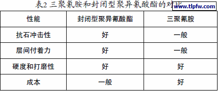 汽车中涂介于电泳涂料和汽车面漆之间,起着过渡层的作用。中涂涂装的主要目的是在提高涂层的抗冲击性的同时,掩盖底层的凹凸,有助于提高面漆的鲜映性,同时中涂可以提高涂层间的附着力和金属闪光色面漆的耐候性。中涂的基本树脂是聚酯树脂,一般采用三聚氰胺树脂和封闭型聚异氰酸酯作为交联固化剂。三聚氰胺的主要优势在于低成本、提高硬度和打磨性,封闭型聚异氰酸酯的优势在于提高抗石冲击性和层间附着力。表2列出了三聚氰胺和封闭型聚异氰酸酯的对比。