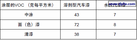 中涂水性化和面漆水性化是减少VOC的主要措施 ,罩光清漆水性化也是一个研究方向,但是清漆水性化的技术还需要很长的路要走。中涂和面漆的水性化,特别是面漆的水性化对减少VOC很关键,因为面漆的固含量很低。下表列出了溶剂型汽车漆和水性汽车漆的VOC排放的对比。