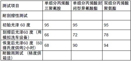 表3 丙烯酸三聚氰胺、丙烯酸封闭型聚异氰酸酯和双组分丙烯酸聚氨酯的对比
