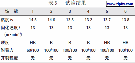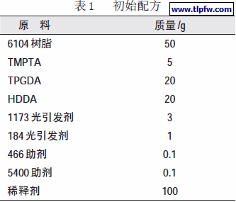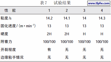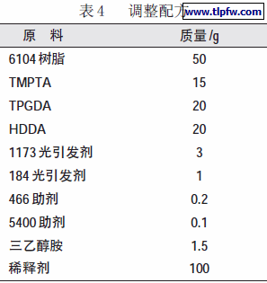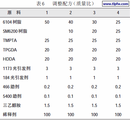 试验结论:此配方硬度不够,边缘无发粘现象,采用配方4 的稀释剂体系继续试验,加大TMPTA 用量,同时做树脂调换试验,调整配方见表6。试验结果见表7。