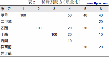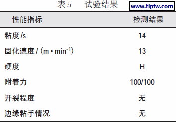 试验结论:此配方硬度不够,边缘有发粘现象,采用配方5 的稀释剂体系继续试验,加入胺类助引发剂。调整配方见表4。试验结果见表5。