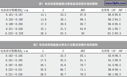 (1)对于无中涂层的卡车而言,电泳涂层的粗糙度Ra 必须控制在0.19 μm以下,否则将对面漆的桔皮和DOI产生不良影响。