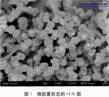微胶囊可呈球形、粒状或絮状,囊壁可以是单层或多层结构,芯材可以是单核或多核。图3 所示为芯壁比( 乳液中固体分的质量∶ MF 预聚体溶液中固体分的质量,下同) = 1. 2∶ 1的微胶囊形态的SEM 图。从图中观察到胶囊呈粒状且粒径分布比较均匀,表面有凹坑,可能是产品70 ℃出料后在冷水洗涤时因芯材和壁材的冷热收缩率不同造成的。