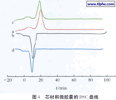 图4 所示a、b 和c、d 曲线分别为混合芯材和芯壁比=1. 2∶ 1的微胶囊的DSC 吸热、放热曲线图。