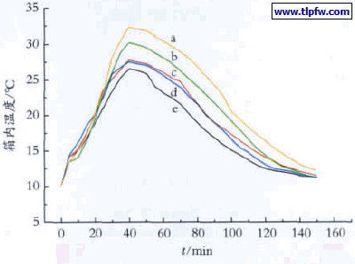 在( 10 ± 2) ℃环境温度下,取等质量芯壁比分别为0. 8∶1、1∶ 1、1. 2∶ 1、1. 4∶ 1、1. 6∶ 1的微胶囊,制得编号依次为a、b、c、d、e 的相变储能调温内墙涂料,均刷涂5 道于石棉水泥板上,待样板实干后置于保温箱内,测得不同时间下各箱内温度变化曲线如图5 示。