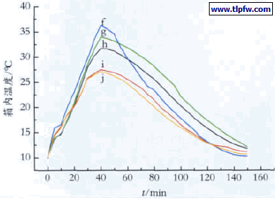 制备平均涂层厚度分别为0. 5 mm、0. 7 mm、1. 0 mm 和1. 2 mm 的样板,编号依次为g、h、i、j,置于保温箱内,测得不同时间下各箱内温度变化曲线如图6 示。