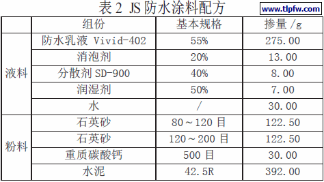 ⑵聚合物水泥防水涂料(JS):聚合物水泥(JS)复合防水涂料是由液体组分和固体组分组成的双组分水乳型防水涂料,其中液体组分主要是丙烯酸酯乳液(PAM),采用上海三瑞企业的Vivid-402 丙烯酸弹性聚合物乳液,并添加有各种助剂,固体组分则是无机粉料,水泥是其主要成分。配方表见表2。
