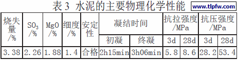 ⑶水泥(C):安徽宁国水泥厂生产的海螺牌P·O42.5 普通硅酸盐水泥,勃氏比表面积350m2/kg。水泥的主要物理化学性能见表3。