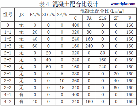 试验采用固定原拌混凝土的砂率Sp=40%、水胶比0.4,通过调整减水剂的掺量控制混凝土的塌落度,对比试验研究单掺粉煤灰、矿渣掺量分别为20%、40%和60%或硅粉掺量分别为5%、10%和15%对混凝土抗氯离子渗透性能的影响。另外,取空白混凝土及粉煤灰掺量为40%的混凝土在表面涂聚合物水泥防水涂料,对比试验研究聚合物水泥防水涂料及与粉煤灰共同作用对混凝土抗氯离子渗透性能的影响。混凝土的配合比设计见表4。