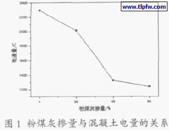 ⑴粉煤灰:单掺粉煤灰,掺量分别为20%、40%和60%的混凝土6 小时电通量的试验结果见图1。