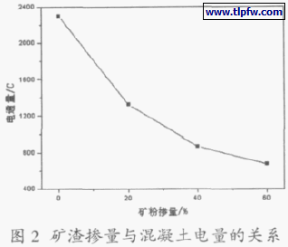 ⑵矿渣:单掺矿渣,掺量分别为20%、40%和60%的混凝土6 小时电通量的试验结果见图2。