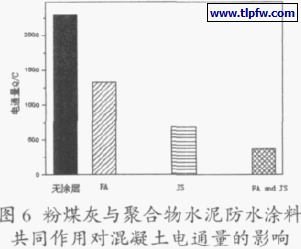 ⑶矿物掺合料与聚合物水泥防水涂料复合作用,对混凝土的抗氯离子渗透性能的提高效果更明显。