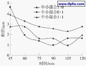 将不同大小的研磨珠混合来研磨油墨, 以考察混合大小研磨珠对油墨分散性的影响。由于本实验所选用的大号研磨珠与中号研磨珠的研磨效果相似, 因此只将中号研磨珠与小号研磨珠以1: 1的比例混合研磨油墨, 测试所获得的油墨的粒径,并与单纯使用中号、小号研磨珠的研磨效果相比较, 如图3所示。
