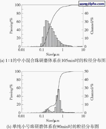为了更好地比较1: 1的中小混合珠研磨体系和单纯小号珠研磨体系的研磨效果, 我们对二者在最佳研磨时间下的粒径分布图进行比较, 如图4所示。