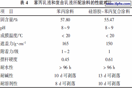 通过性能对比发现,硅溶胶-苯丙复合涂料的性能优于仅以苯丙乳液作基料的乳胶涂料。检测结果显示,该涂料兼具无机涂料和有机涂料的特性,涂膜的力学性能及耐水性都得到了提高,详见表4。