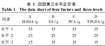 为了从大量的试验点中挑选适量的具有代表性的点, 利用正交实验来优化试验设计。基于各因素对漆膜性能的影响, 在单因素实验的基础上,分别选择HDDA、环氧丙烯酸酯( EA)、聚氨酯丙烯酸酯( PUA )、TPGDA为主要实验因素, 进行四因素三水平正交试验。为了有效减少实验次数, 采用L9( 43 ) 正交表进行正交实验, 具体设计中不考虑各因素间的相互影响, 因素- 水平的设置见表1。