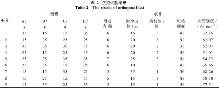 注: 附着力指标中1 级为最好, 7级为最差; 柔韧性指标中1 级为最差, 7级为最好; 耐冲击性和硬度指标中, 数值越大, 性能越好; 击穿强度在漆膜常态下测定。