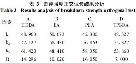 直接观察表2数据可知, 各组实验中UV绝缘漆的最大击穿强度为68.26 kV /mm, 综合性能最好的一组为7号配方, 同时可以看到各组配方的附着力、柔韧性等力学性能均欠佳, 需要加入助剂、单体或含柔性基团的低聚物来进行调整。紫外光固化绝缘漆的最主要性能是其电性能, 运用极差分析对击穿强度的实验结果进行评定, 如表3所示。