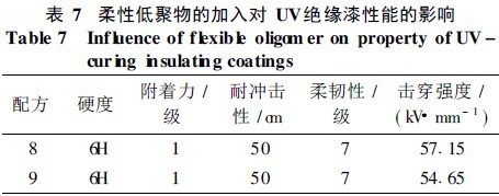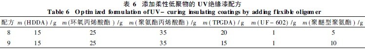 由正交实验的分析结果可知, 因素D( TPGDA )对UV 绝缘漆的电性能影响最小, 在配方6的基础上, 减少TPGDA 的量,加入含柔性链段的低聚物( 二官能团聚醚型聚氨酯), 对漆膜硬度和柔韧性进行调整。结果见表6和表7。