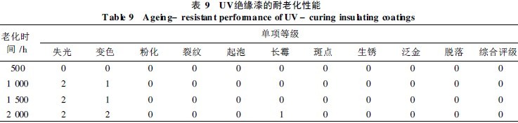 为考察UV绝缘漆的耐老化性能, 在紫外老化试验箱内进行人工加速试验, 结果见表9。