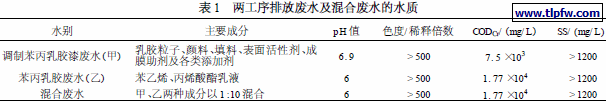 废水取自大连乳胶漆厂,它来自配制乳胶漆和乳液两道生产工序的冲洗水。每次排放的废水水质如表1 所示。废水的排放量不大,以混合废水计,每次约4. 5 m3 。