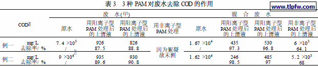 3 种PAM对于降低废水COD 的试验结果如表3 所示。