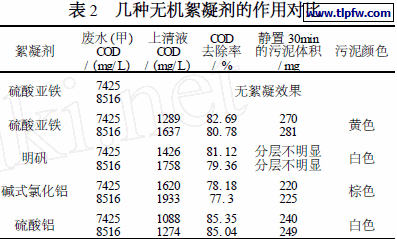 将5 mL 10 %硫酸亚铁、硫酸铁、明矾、碱式氯化铝、(AS) 溶液分别对pH值已调到8的1L废水(甲) 进行处理。经搅拌、静置后测定有关项目,其结果列如表2。在接近中性的条件下,综合沉降效果、COD 去除率、污泥的再利用等因素来考虑, (AS) 优于其它几种絮凝剂。