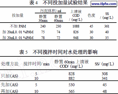 絮凝剂的不同添加次序和方法对废水处理效果影响颇大。用(AS) 和PAM 对COD 为9 ×103mg/L 的废水(甲) 进行絮凝试验。若先加(AS) 静置1 h ,SS 可从1250 mg/ L 降到361 mg/ L 。再加入PAM则SS 不再降低;光加(AS) 搅拌2 min 立即加入PAM,慢搅后静置,废水中悬浮物可基本除尽;若先加PAM则絮状物不分层,继续加(AS) ,也无改善之迹象。这可能是由于PAM 分子具有较多的亲水基团,对有机可溶物的凝析、脱水起了负作用之故。